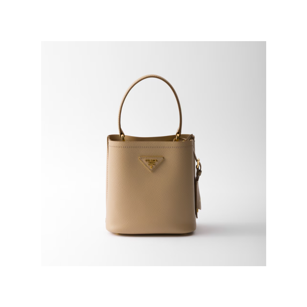 18*17*10.5cm 프라다 파니에 백의 세련된 기하학적 디자인을 컴팩트하고 고급스러운 미니 버전으로 재해석한 제품입니다. 프라다 컬렉션의 상징적인 소재인 사피아노 가죽으로 제작되었으며, 뛰어난 장인정신을 표현하는 세련된 디테일로 장식되어 있습니다.