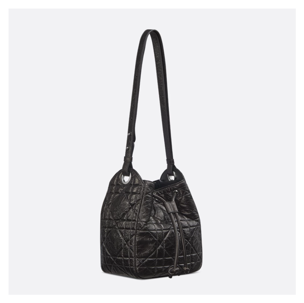size:17*19.5*11cm 2025-2026 가을-겨울 패션쇼에서 선보인 모던하고 활용도 높은 버킷 디자인의 D-Motion 백입니다. 블랙 매크로까나쥬 크링클 송아지 가죽 소재로 제작된 부드러운 스타일로, 드로우스트링 클로저를 열면 지퍼 포켓과 넉넉한 내부 수납공간이 나타나 데일리 소지품을 모두 보관할 수 있습니다. 실버 피니시 메탈 D.I.O.R. 블록 참으로 완성된 스몰 백으로, 슬라이딩 디자인의 길이 조절 가능한 스트랩이 있어 숄더백 또는 크로스백으로 연출하기 좋습니다.