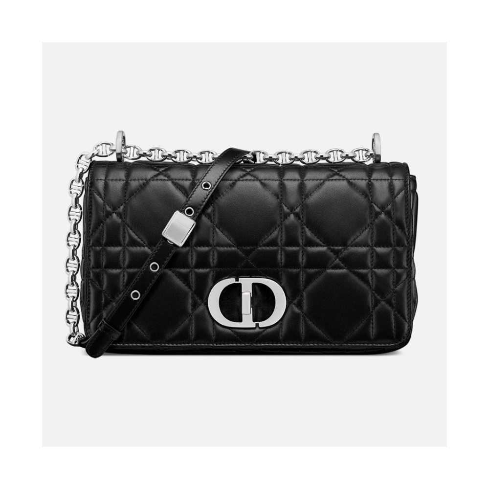 Size:20×13×7cm 2025년 가을에 새롭게 선보이는 소프트 Dior Caro 백은 모던함과 유행을 타지 않는 우아함을 결합한 유연한 구조가 특징입니다. 고급스러운 블랙 양가죽 스타일에 매크로까나쥬 스티칭이, 플랩에는 Christian Dior 향수병 마개에서 영감을 받은 앤티크 실버 피니시 메탈 CD 트위스트 잠금장치가 장식되어 있습니다. CD 링크로 이루어진 탈착식 체인 스트랩을 활용해 핸드백, 숄더백, 크로스백으로 착용하기 좋은 미디엄 백으로, 디올 하우스의 다양한 와이드 자수 스트랩을 매치해 데이 룩이나 이브닝 룩을 연출할 수 있습니다.