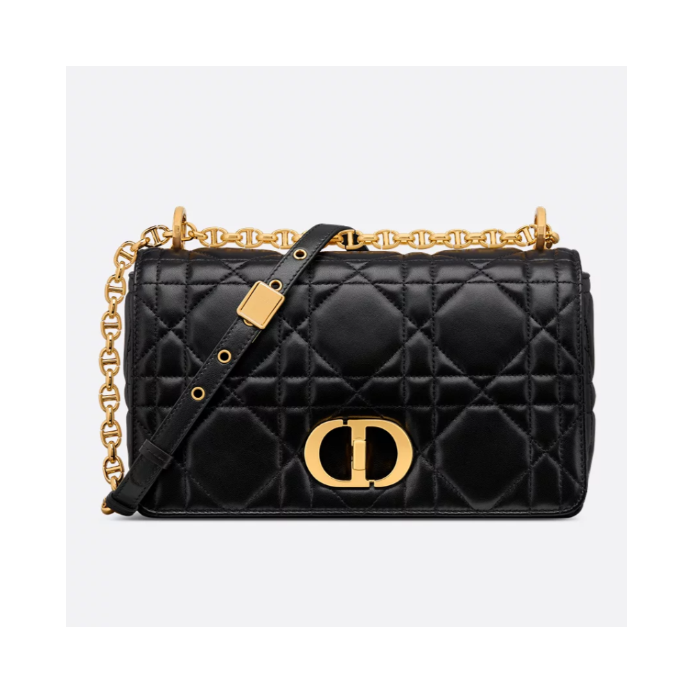 Size:20×13×7cm 2025년 가을에 새롭게 선보이는 소프트 Dior Caro 백은 모던함과 유행을 타지 않는 우아함을 결합한 유연한 구조가 특징입니다. 고급스러운 블랙 양가죽 스타일에 매크로까나쥬 스티칭이, 플랩에는 Christian Dior 향수병 마개에서 영감을 받은 앤티크 실버 피니시 메탈 CD 트위스트 잠금장치가 장식되어 있습니다. CD 링크로 이루어진 탈착식 체인 스트랩을 활용해 핸드백, 숄더백, 크로스백으로 착용하기 좋은 미디엄 백으로, 디올 하우스의 다양한 와이드 자수 스트랩을 매치해 데이 룩이나 이브닝 룩을 연출할 수 있습니다.
