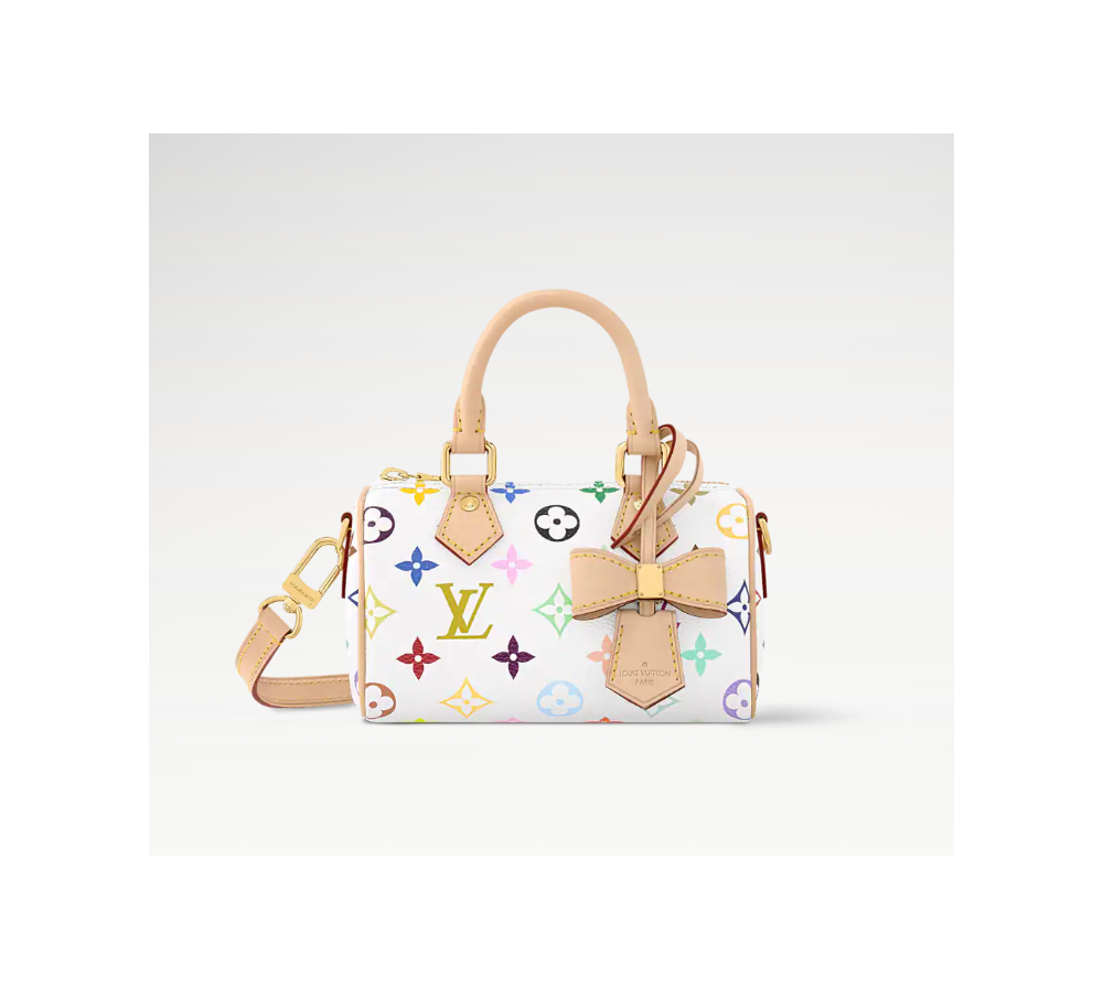 16 x 10 x 7.5 cm 상품번호:M13391 경쾌한 분위기를 자아내는 작은 크기로 구현한 나노 스피디. 루이 비통 x 무라카미 리에디션 컬렉션에서 생기 있는 색조로 재해석한 모노그램 코팅 캔버스 소재. 천연 카우하이드 가죽 소재의 트리밍, 두 개의 상단 토론 핸들, 하우스의 여행 헤리티지에 오마주를 바치는 반짝이는 골드 색조의 패드락으로 클래식한 감각을 더한 아이템. 탈착 및 조절 가능한 스트랩과 익스클루시브한 LV x TM 키벨.