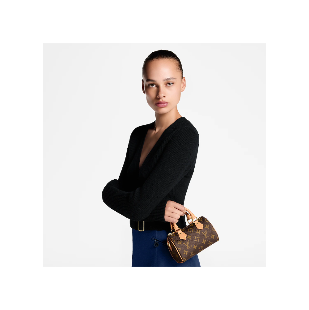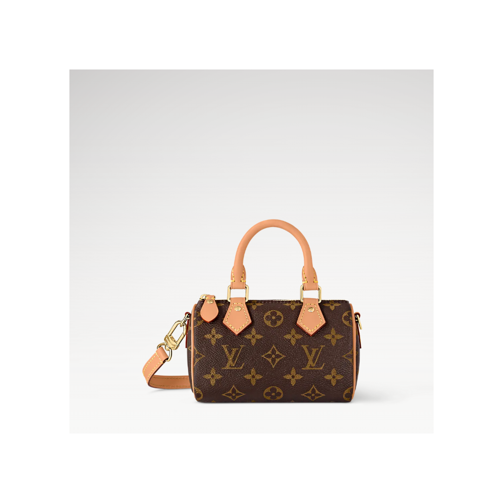 16 x 10 x 7.5 cm 상품번호:M81085 루이 비통의 아이코닉한 스피디 백을 미니어처 버전으로 새롭게 선보이는 나노 스피디(Nano Speedy). 모노그램 캔버스 소재. 필수품을 휴대하기 좋은 크기의 아이템. 에이징 처리한 천연 카우하이드 가죽 소재와 골드 색상의 하드웨어가 조화를 이루는 아름다운 디자인. 두 개의 핸들과 탈착 및 조절 가능한 숄더 스트랩을 활용해 다양한 스타일로 연출할 수 있는 백.