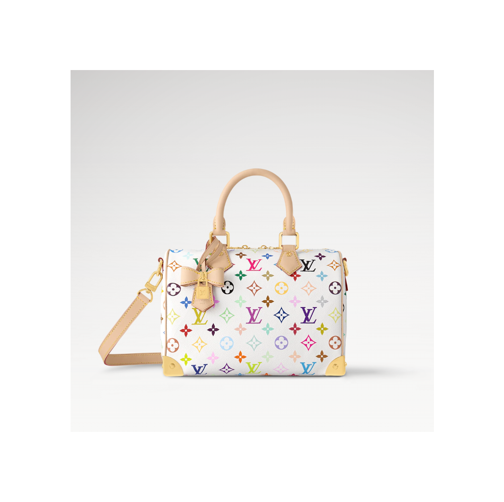 25 x 19 x 15 cm 상품번호:M13085 루이 비통 x 무라카미 컬렉션에서 일본 예술가 무라카미를 대표하는 팝 색상으로 경쾌하게 재해석한 상징적인 모노그램 모티프를 더해 생기 넘치는 버전으로 선보이는 스피디 반둘리에 25 핸드백. 천연 카우하이드 가죽 소재로 제작한 두 개의 토론 상단 핸들, 탈착 및 조절 가능한 스트랩, 보타이 형태의 유쾌한 LV x TM 키벨이 특징인 클래식한 디자인. 하우스의 상징적인 여행용 트렁크에 오마주를 바치는 골드 색상의 패드락 및 모서리 디테일.